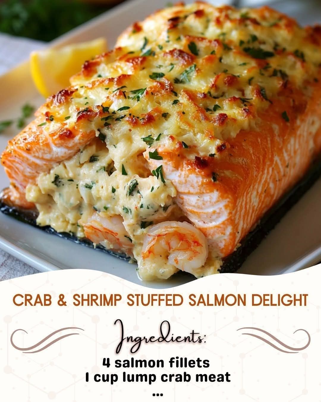 Seafood lovers rejoice! This Crab & Shrimp Stuffed Salmon Delight is the ultimate oceanic indulgence—flaky salmon fillets generously filled with a creamy, savory stuffing made from crab meat, shrimp, herbs, and cheeses. It’s elegant enough for special occasions yet simple enough for a weeknight dinner.