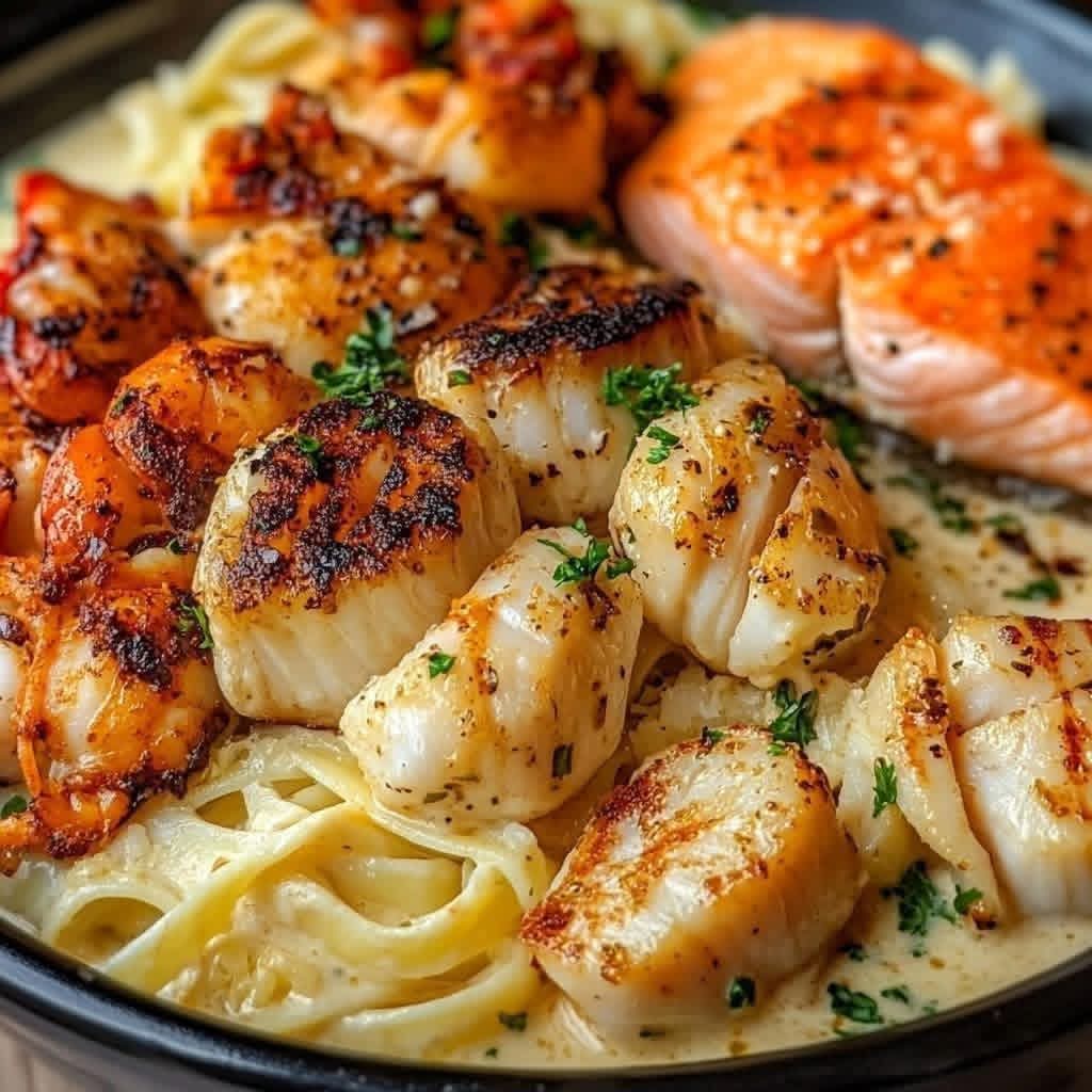 Fettuccine Alfredo is a beloved Italian-American pasta dish known for its creamy, rich sauce. This deluxe version elevates the classic by blending tender chicken breast with succulent seafood — shrimp, scallops, and crab — offering a luxurious twist perfect for special occasions or indulgent dinners. Marrying the land and sea in one creamy, satisfying plate, this dish is both hearty and elegant.