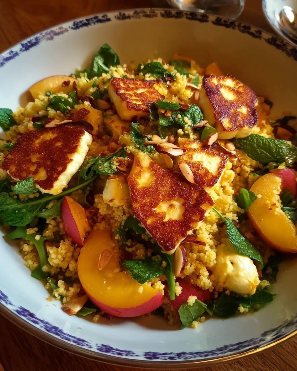 Enjoy your Lemon Couscous with Halloumi, Toasted Almonds & Peach — it’s a bowl of sunshine that’s sure to impress!