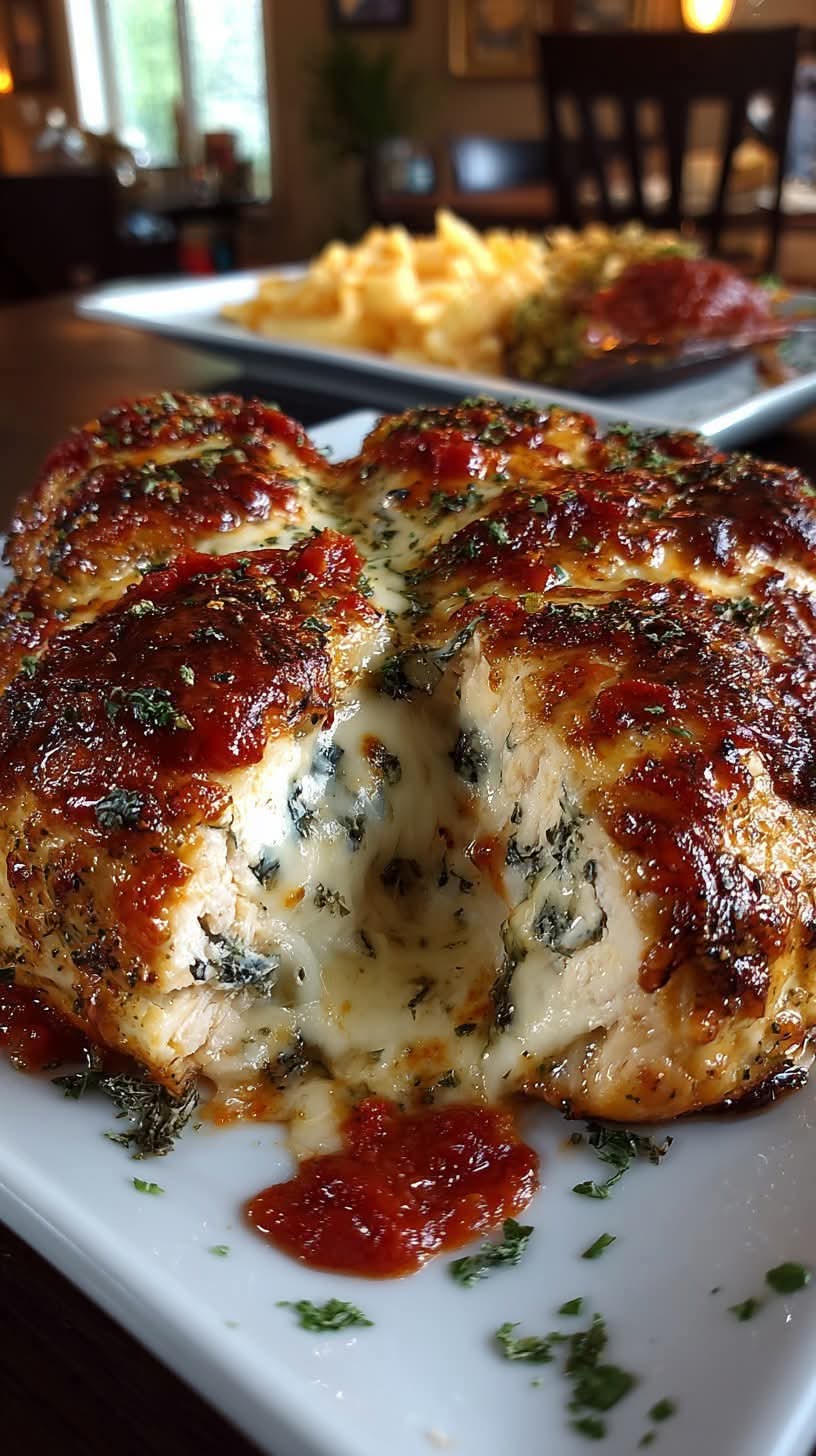 If you love both pizza and juicy roasted chicken, this recipe is a dream come true. The chicken breasts are stuffed with gooey mozzarella, tangy pizza sauce, and aromatic herbs — then baked to golden perfection. Each bite bursts with Italian flavors, but with a French twist in presentation and technique. Serve this for a cozy family dinner or an impressive date-night meal.