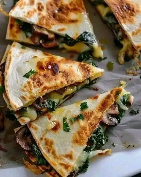 - Préparer les tortillas : Sur une surface propre, étalez une tortilla, puis répartissez une portion généreuse du mélange d’épinards et de champignons au centre de la tortilla. Saupoudrez de fromage râpé. Recouvrez avec une autre tortilla.