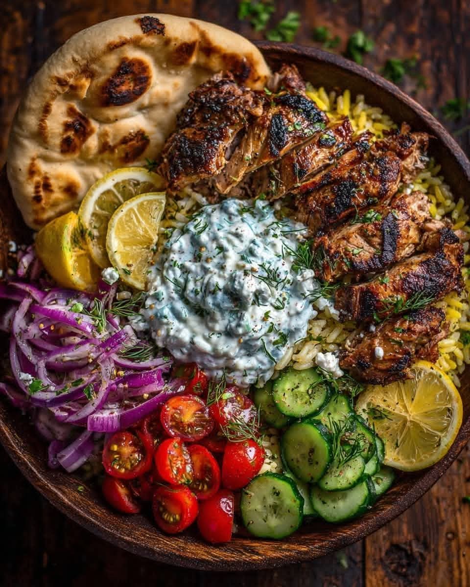These Greek Chicken Gyro Bowls are inspired by classic Mediterranean flavors—juicy marinated chicken, fluffy rice, crisp vegetables, and a rich, tangy creamy feta sauce that ties it all together. Perfect for weeknight dinners or meal prep, this bowl is fresh, satisfying, and endlessly customizable. Think gyro vibes… without the pita juggling.